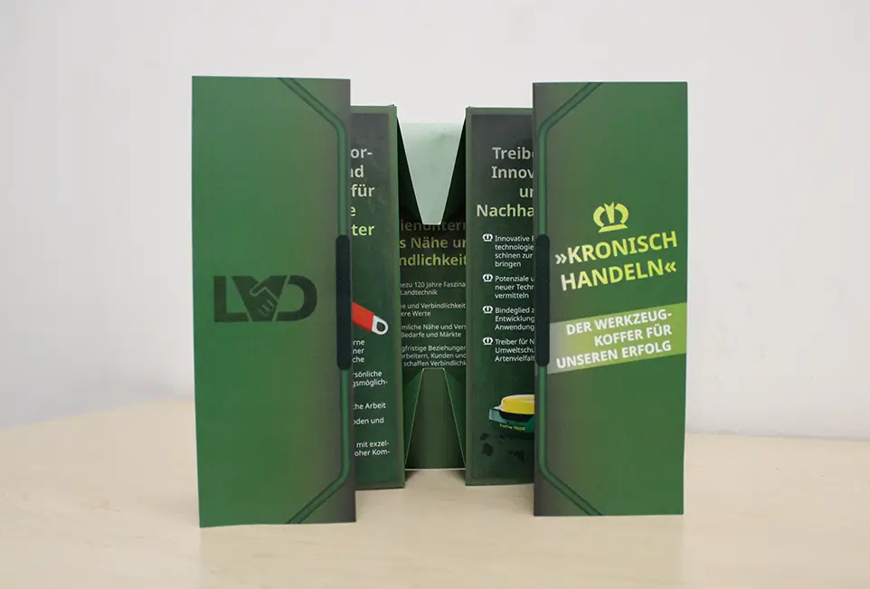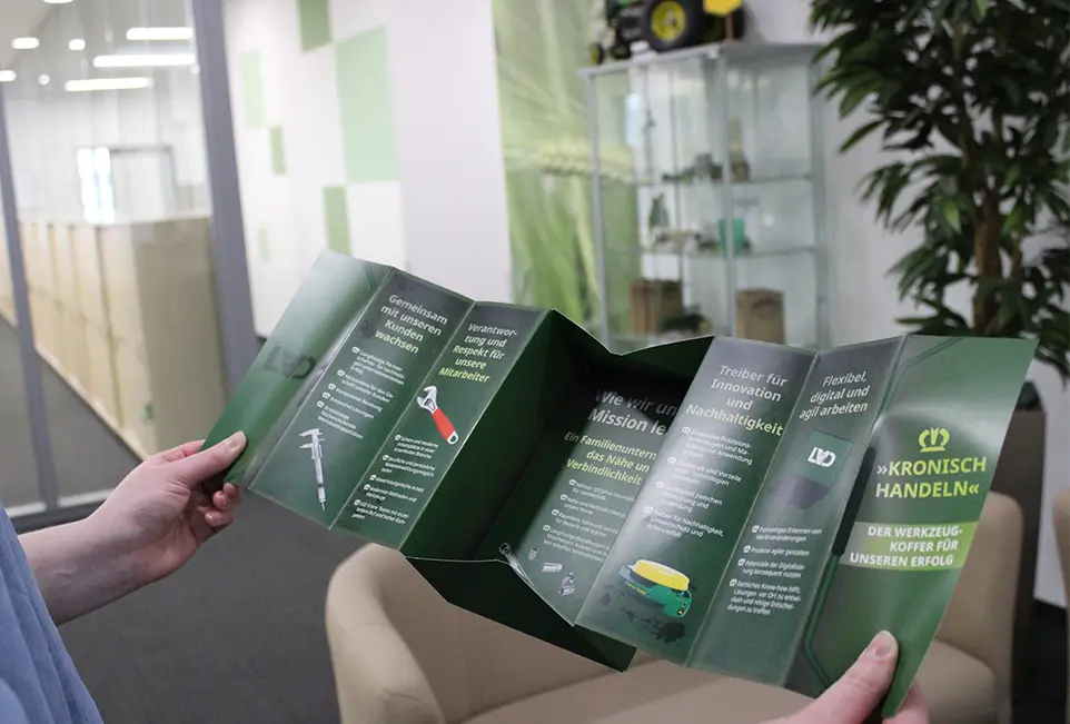 Damit Mitarbeitende, Kunden und Hersteller sich besser untereinander verstehen und wissen an welchen Werten und Normen sie beim LVD Krone sind, wurde das LVD Krone Leitbild erstellt. Dieses Leitbild wurde in verschiedenen Workshops im Jahr 2023 entwickelt und Anfang 2024 eingeführt. Der LVD „Kronisch Handeln“ Werkzeug­koffer visualisiert dieses Leitbild.